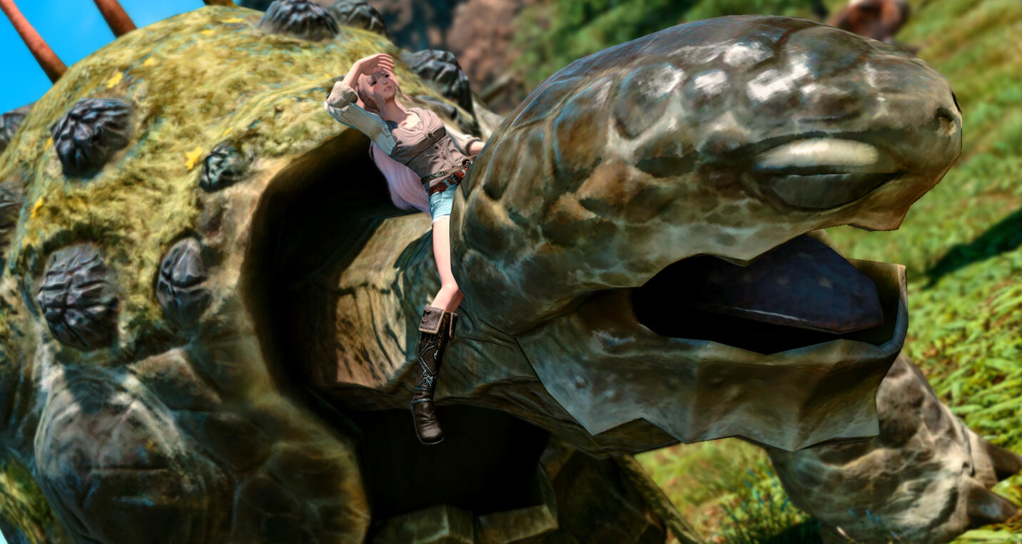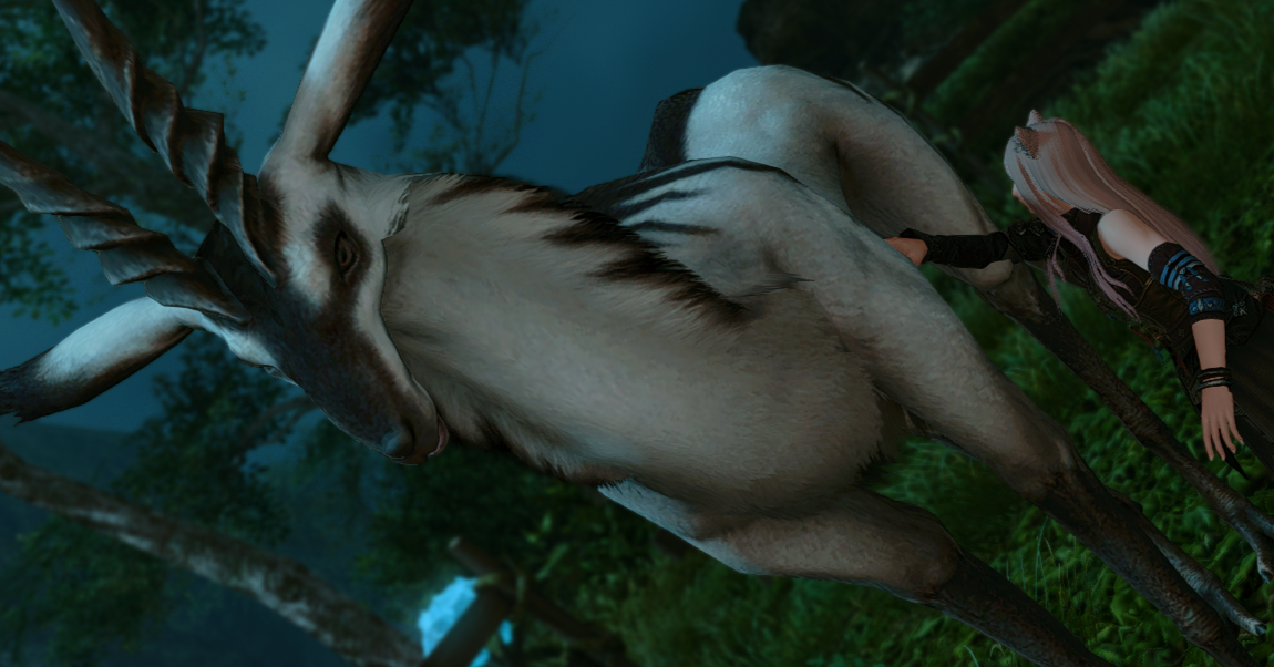 Perched atop Greyson, the gentle giant of Whispering Glades, Aria sways with each lumbering step of the goobbue. Her eyes shine with a mix of excitement and tranquility as she pats his mossy shoulder."Good boy, Greyson," she murmurs with a smile. "You’re already making this place feel even more magical."Around them, the sanctuary comes alive with soft rustles and chirps, as if the other residents welcome their new companion in unison.