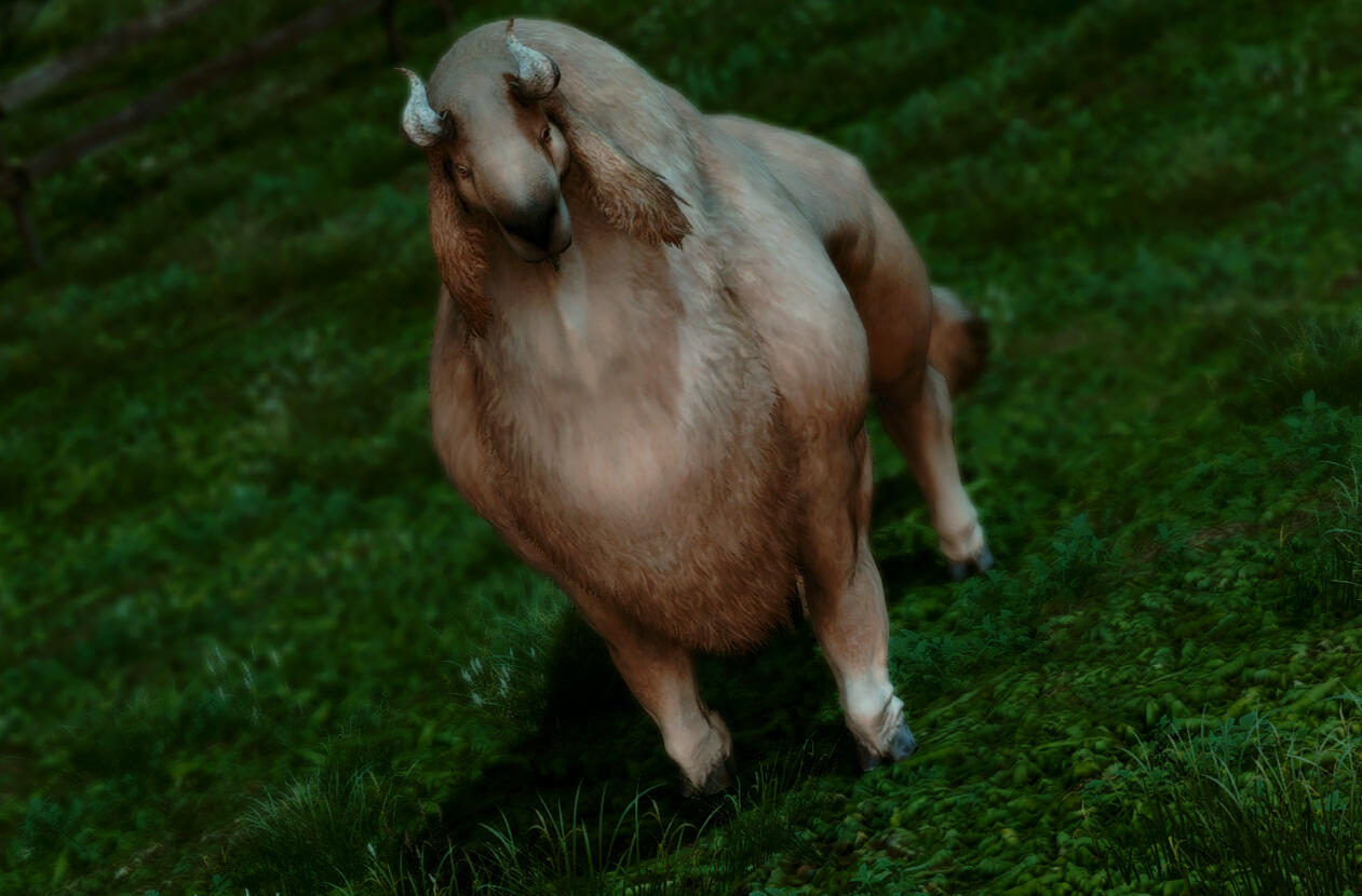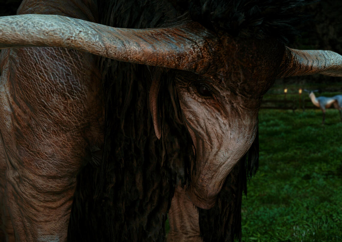 Ambrose stands near the edge of the sanctuary, his massive form casting a long shadow over the lush grasses. His fur is thick and dark, resembling the coat of a giant bison, though with a strange, almost ethereal glow to it. His large, gentle eyes flicker with curiosity as he watches Aria move about, his massive horns sweeping out to either side in slow, lazy arcs.Aria carefully approaches, her brow furrowing with concentration as she crouches beside him. She gently lifts one of his hooves, her fingers brushing over the rough pads. She remembers the day she found him— injured, dragging himself slowly across the forest floor, a large rock lodged painfully in his foot. Without hesitation, Aria had tended to him, and since then, he's been one of the most peaceful and trusting residents of the Glades."How’s that foot today, Ambrose?" she murmurs, her voice soft and comforting as she presses her palm against the healed pad. The giant creature snorts, nudging her with his large head affectionately, nearly knocking her over with his surprising strength.“Easy there, big guy,” she laughs, brushing the dirt off her hands as she pats his side. "I still don’t know what to call you, but I’m glad I found you. You’re a good one, aren’t you?"Ambrose snorts again, his large tail swishing in contentment, his eyes soft with trust. Though Aria doesn’t know what he is, she knows he belongs here— just as much as the rest of her creatures.